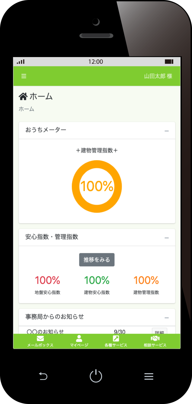 建物の定期点検以外にも必要と考えられる内容をパッケージして、数値化して点数化されセルフメンテナンスの楽しみをプラスしています。